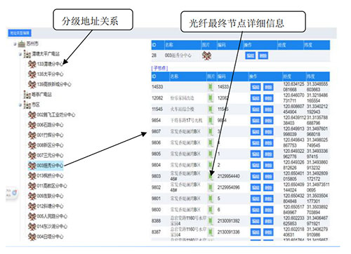 舉例:下圖是一個(gè)蘇州市的光纖網(wǎng)絡(luò)地址分級(jí)管理圖,可以細(xì)化到每根光纖的名稱、ID 號(hào)、編碼、經(jīng)緯度等信息,還可實(shí)時(shí)進(jìn)行編輯